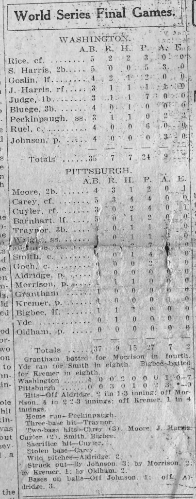 I run across a lot of neat things working at a newspaper. For instance, a woman donated some old newspaper clippings to us here at the paper not long ago. There is a lot of World War I and various miscellany of the few decades surrounding that time period in the stack she brought up. Interestingly, a clipping on the back of one of the preserved articles was what got my attention: “Pirates beat Griffs for Baseball Title: Cuyler’s Double in Eighth Wins Last Game and World Championship.” It was, of course, a portion of an article for the 1925 World Series game. One thing that I could discern from the article, is that sports writers are very much the same now as they were then: good sports writers are – whether you want to admit it or not – better journalists than many a beat reporter or paid writer for national news publications. Their work is precise, witty, often humorous, and pleasant to read. I wish there was a national day of “switch news writing” when all sports journalists could write an article or two for a national event. I think the public at large would be surprised – and probably pretty satisfied. Sports writers get lost in the details and the details support their opinions and perceptions.
